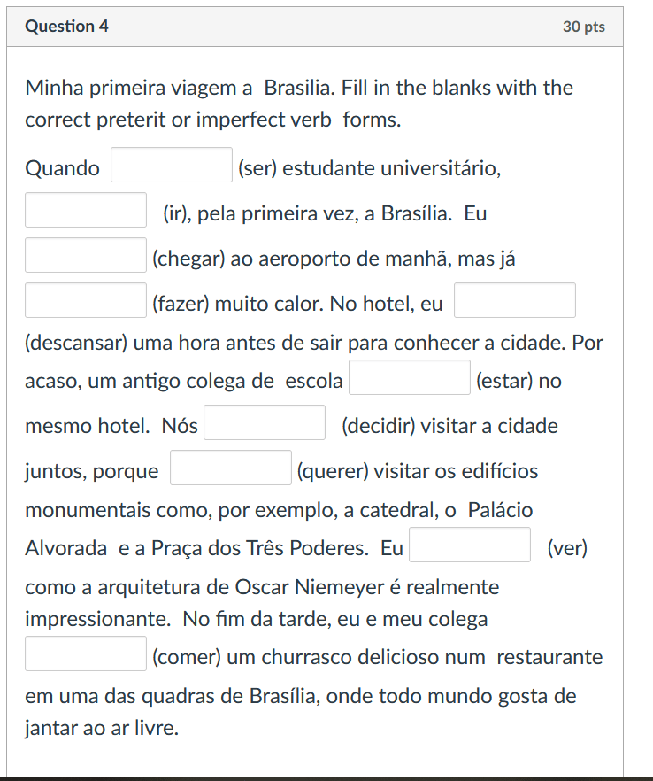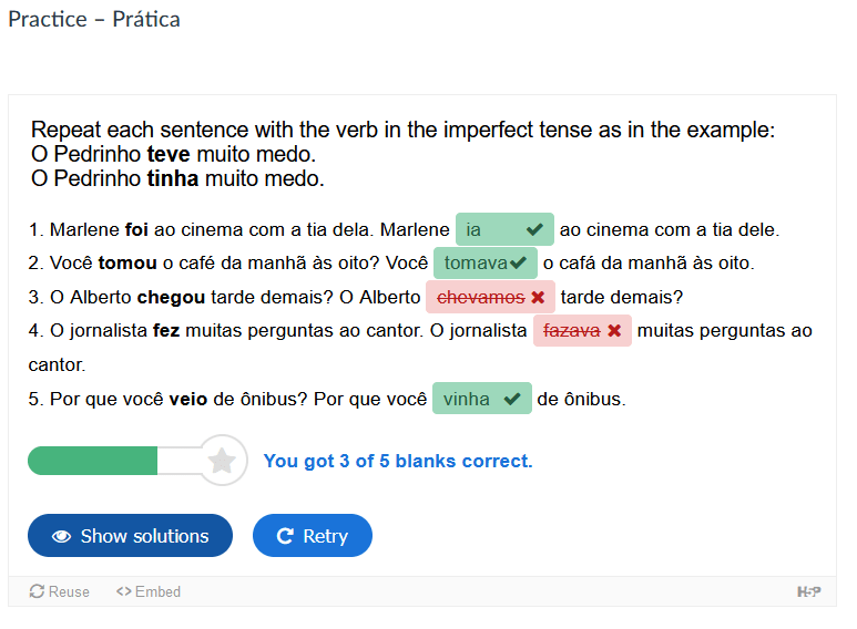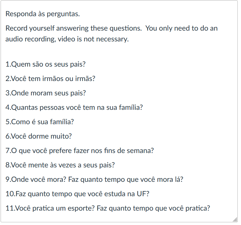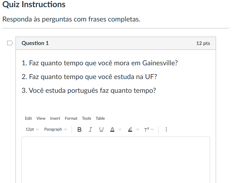 Some of the grammar assessments are open ended questions that require understanding and use of the grammar concept covered in the lesson and module. This example deals with using the construction Faz + the amount of time to describe length of time doing an activity.
