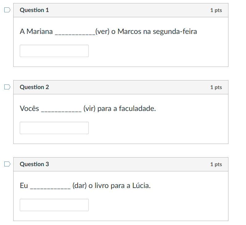 Because of the importance of verb and verb conjugations in Portuguese, this exercise like others, deals merely with having the correct conjugation and that the verb agrees with the subject in person number, as well as clausal mood.