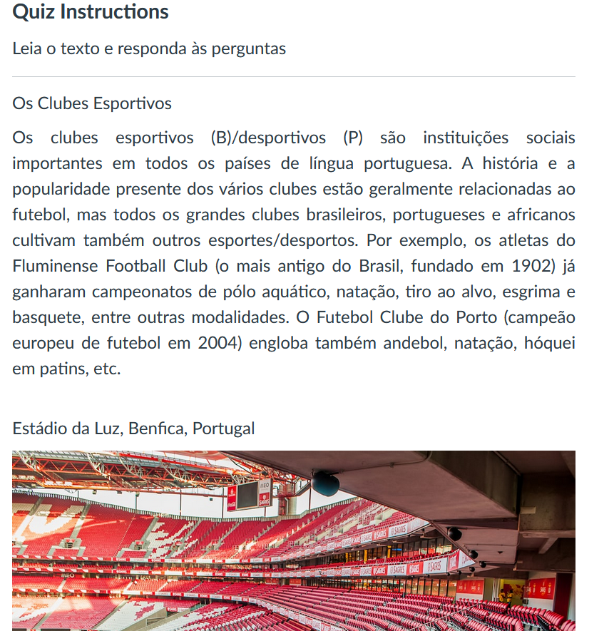 The textbook is made up of a series of Canvas pages that are divided into lesson pages and assessment pages. In total there are over 400 pages divided evenly into lesson pages and assessment pages. Lesson pages include vocabulary, grammar, and cultural information. Assessments are varied in their format from free-response to multiple choice to individual audio/video recordings. For the three semesters of course work, POR 1130, 1131 (3010), 3242, there are nineteen modules. See the links for sample syllabi. Additionally follow these links for other Portuguese courses I have taught: POR 3451, 3500, 3701, 4420