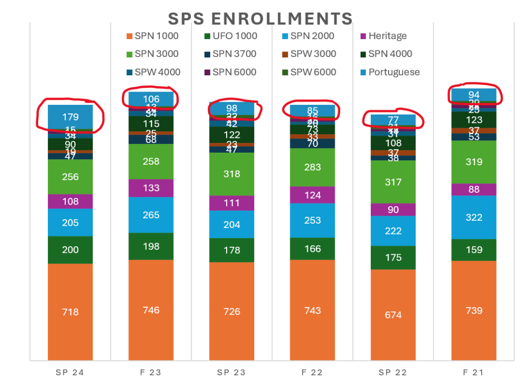 The total enrollment in Portuguese courses as increased by nearly 100% due to the new courses that I created, POR 1130/1131 online version and PRT 1515. The average enrollment was 88.5 from Fall 2021 to Spring 2023, and now the total average has been 142.5 since the Fall of 2023.